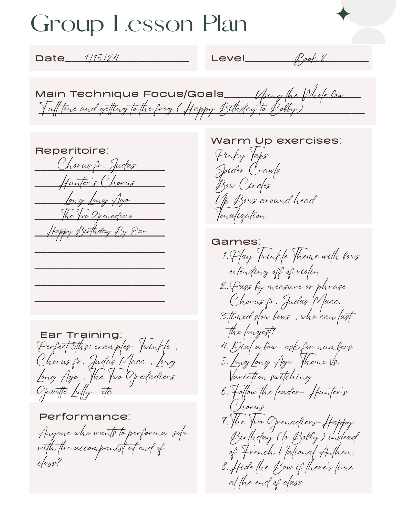 Mastering the art of Suzuki style group lessons requires thoughtful planning and creativity. By incorporating main techniques, warm-up exercises, repertoire, games, ear training, and performance opportunities, teachers can create enriching musical experiences for their students. This group lesson template and bonus lists offer valuable resources to streamline the planning process, making each group lesson organized, efficient, and enjoyable.
